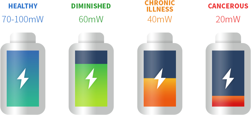 Q&A 体が電磁場を生成して使用する方法体の電気活動は主に細胞膜から発生します。細胞膜が適切な「充電」、あるいは電圧を維持することが非常に重要です。健康な細胞は膜通過電位が約80~100ミリボルトです。健康な細胞と比してがん細胞の膜通過電位は20~25ミリボルトと低いです。細胞が損傷したり、病気になったりすると細胞膜の電圧が下がり、細胞内部の電圧が増加します。細胞膜の電圧が低くなると細胞膜のチャンネルがまともに作動せず、疾病誘発作用、すなわち細胞非活動のドミノ効果が現れます。細胞膜は細胞の中身を保護し、イオンが流れることのできる出入り口のような一種の「ゲートキーパー」の役割を果たします。このようなチャンネルを時々「ポンプ」と呼ぶこともあります。